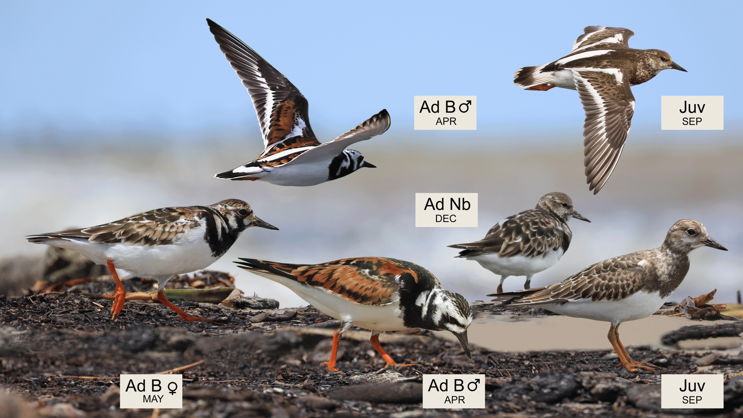 Small, stocky shorebird with dark breastband, short orange legs and unique wedge-shaped bill. In flight, bold white mid-wingbar, another white bar bordering the scapulars, white back and upper tail coverts and broad black subterminal tail band. Ad B: (Mar – Sep) Unique black and white face pattern and black, lobed breastband. Below this, clean white. Upperparts a mix of bright chestnut and black feathers. Females are duller and browner than males. Ad Nb: (Sep – Feb) Similar in pattern to Ad B, but chestnut replaced by dark brown above. Juv: (Aug – Oct) Similar to Ad Nb but wing coverts and scapulars smaller than in adult and clearly edged with buff or ochre-brown.